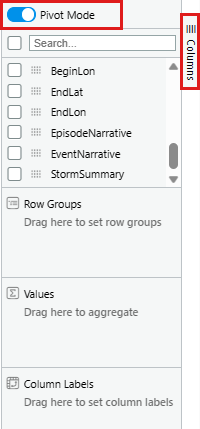 Sul lato destro della griglia dei risultati selezionare Colonne per visualizzare il pannello degli strumenti della tabella. Nella parte superiore del pannello selezionare Modalità pivot.