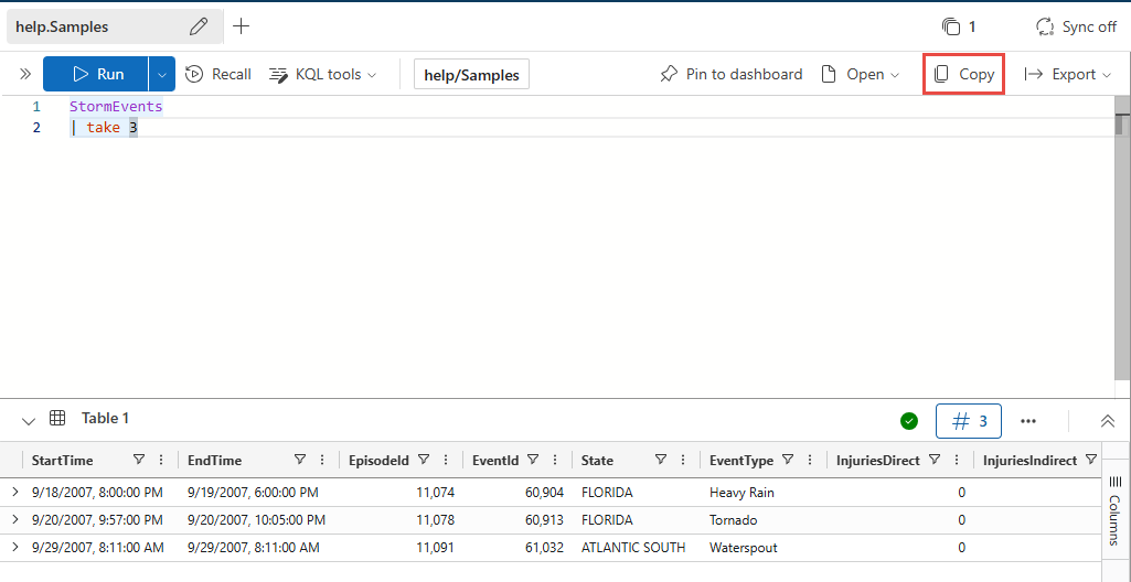 | Copiare i risultati della query negli Appunti | Copiare i risultati della query negli Appunti. Per una maggiore sicurezza, la query condivisa viene aperta in Esplora dati di Azure in modalità protetta. |