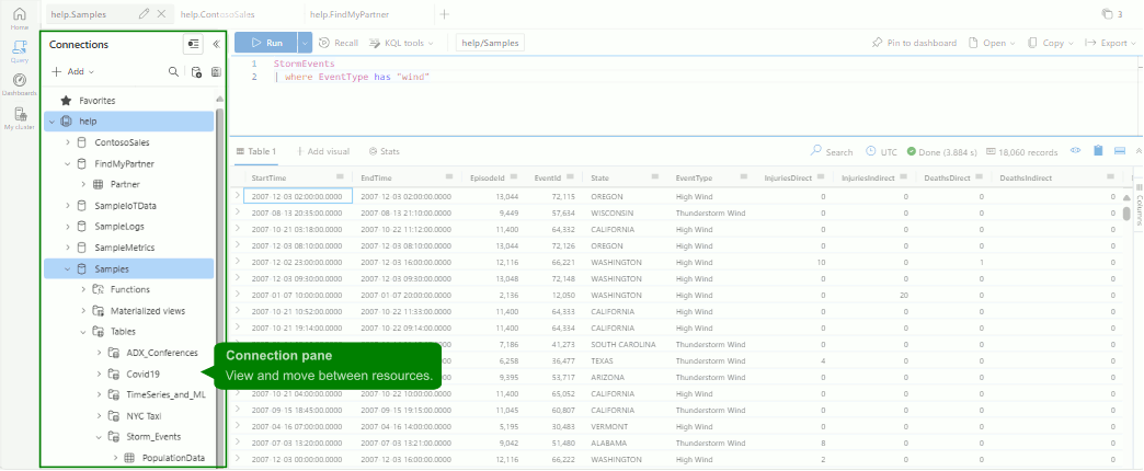 Il riquadro di connessione sul lato sinistro della pagina della query consente di esplorare e passare tra i cluster e i database. In ogni cluster è possibile visualizzare i database inclusi in tale cluster. In ogni database è possibile visualizzare tabelle, funzioni, tabelle esterne e viste materializzate incluse nel database.