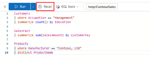 Il pulsante richiamo della query consente di recuperare rapidamente una query eseguita in precedenza. Selezionare la query desiderata e selezionare Richiama per eseguirla di nuovo dai dati archiviati nella cache del browser.