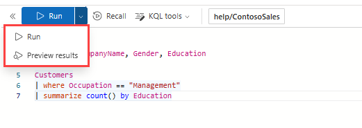 L'editor offre Linguaggio di query Kusto (KQL) IntelliSense e il completamento automatico, fornendo suggerimenti utili durante la scrittura della query. L'editor avvisa anche quando si accede ai dati all'esterno del database selezionato e suggerisce ottimizzazioni delle query. Per restituire tutti i record corrispondenti alla query, selezionare Esegui o premere MAIUSC + INVIO. Per visualizzare un'anteprima di 50 risultati, selezionare il menu a discesa nel pulsante Esegui e selezionare Anteprima risultati oppure premere ALT + MAIUSC + INVIO.