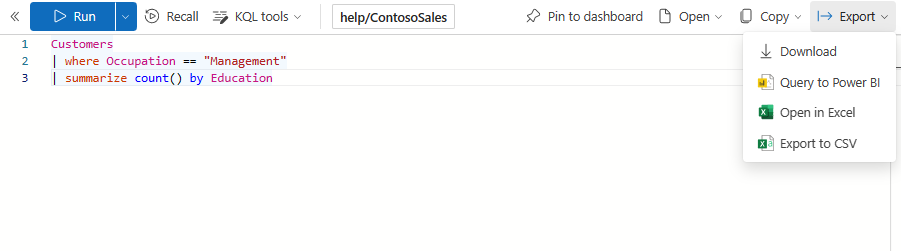 Nella barra degli strumenti della pagina query sono disponibili diverse opzioni per gestire le query e i risultati delle query. È possibile aggiungere una query a un dashboard, copiare query, copiare i risultati delle query ed esportare i dati in formati Power BI, Excel e CSV. Per altre informazioni, vedere Condividere query da Azure Esplora dati'interfaccia utente Web.