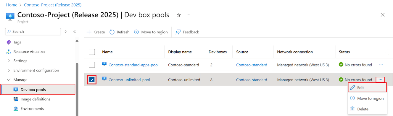 Nella pagina Dev box pools, seleziona la casella di controllo per il pool che desideri modificare, fai clic sull'icona Altre azioni accanto alla voce e quindi seleziona Modifica.