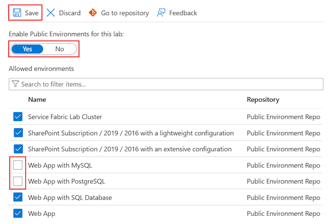 Nella pagina Configurazione e criteri>Basi delle macchine virtuali>ambienti pubblici del portale di Azure nel lab, deselezionare le caselle di controllo accanto agli ambienti da disabilitare.