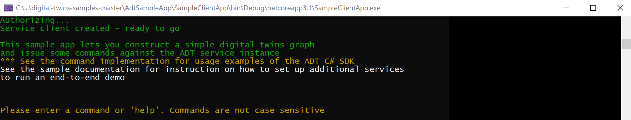 Ora che l'app e l'autenticazione sono configurate, aprire una finestra della console locale per eseguire il progetto. Passare nella finestra della console alla cartella digital-twins-samples-main\AdtSampleApp\SampleClientApp ed eseguire il progetto con questo comando dotnet: