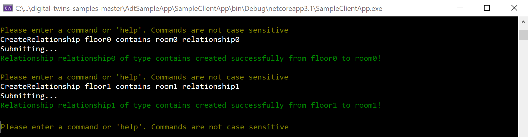 Tornare alla finestra della console aperta alla cartella digital-twins-samples-main\AdtSampleApp\SampleClientApp ed eseguire di nuovo l'app console con