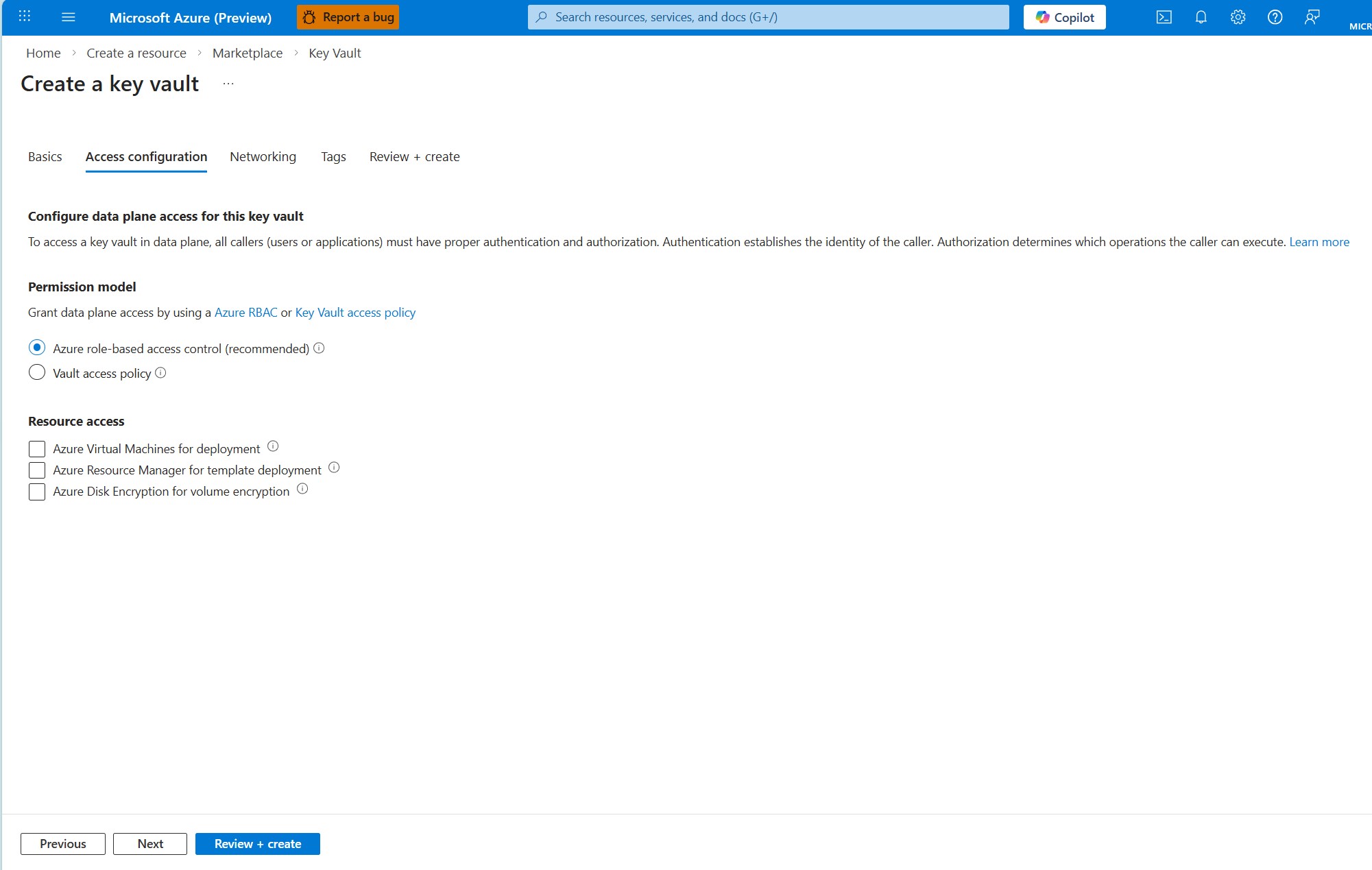 Selezionare Rivedi e crea per creare l'insieme di credenziali delle chiavi.