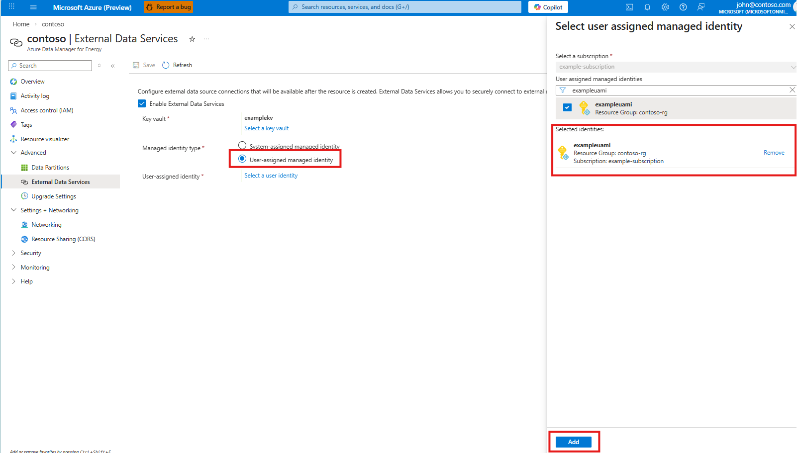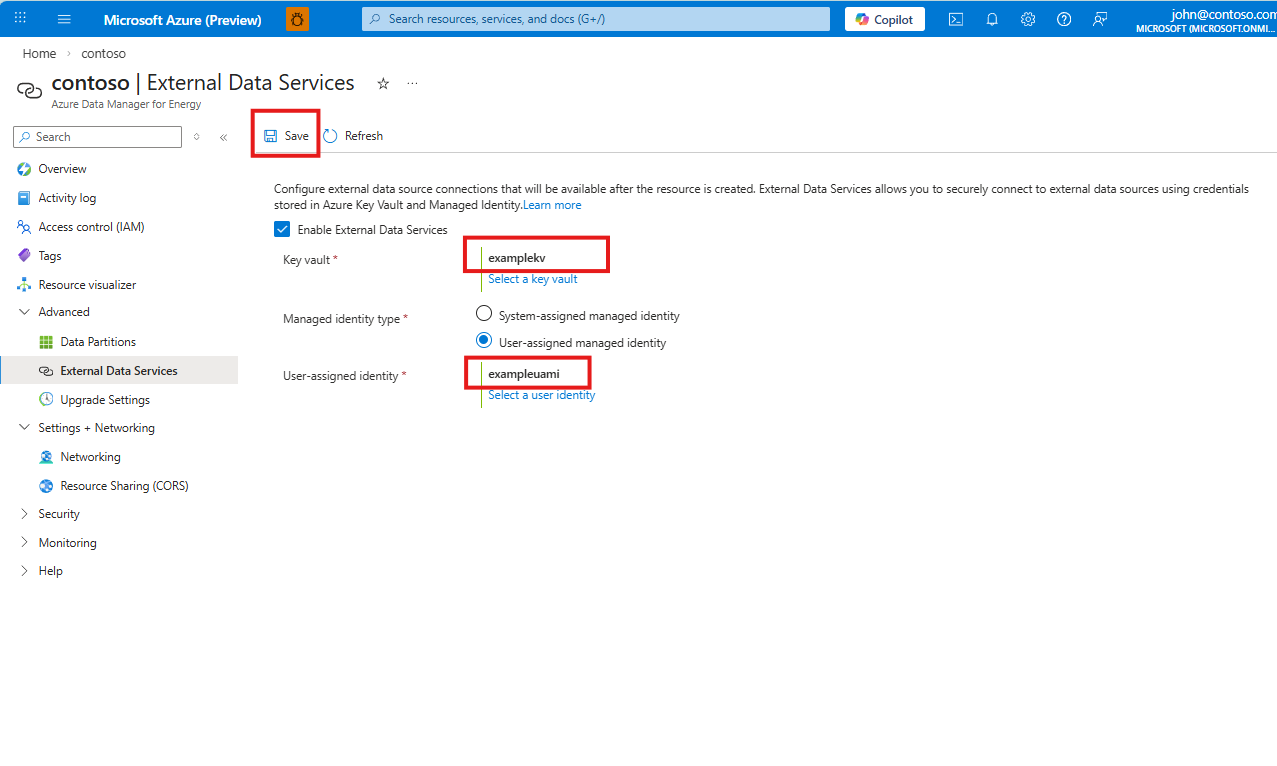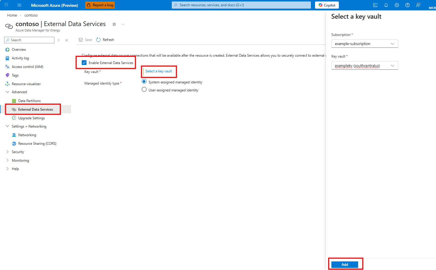 Usare la procedura seguente per abilitare Servizi dati esterni nella risorsa Azure Data Manager per l'energia.