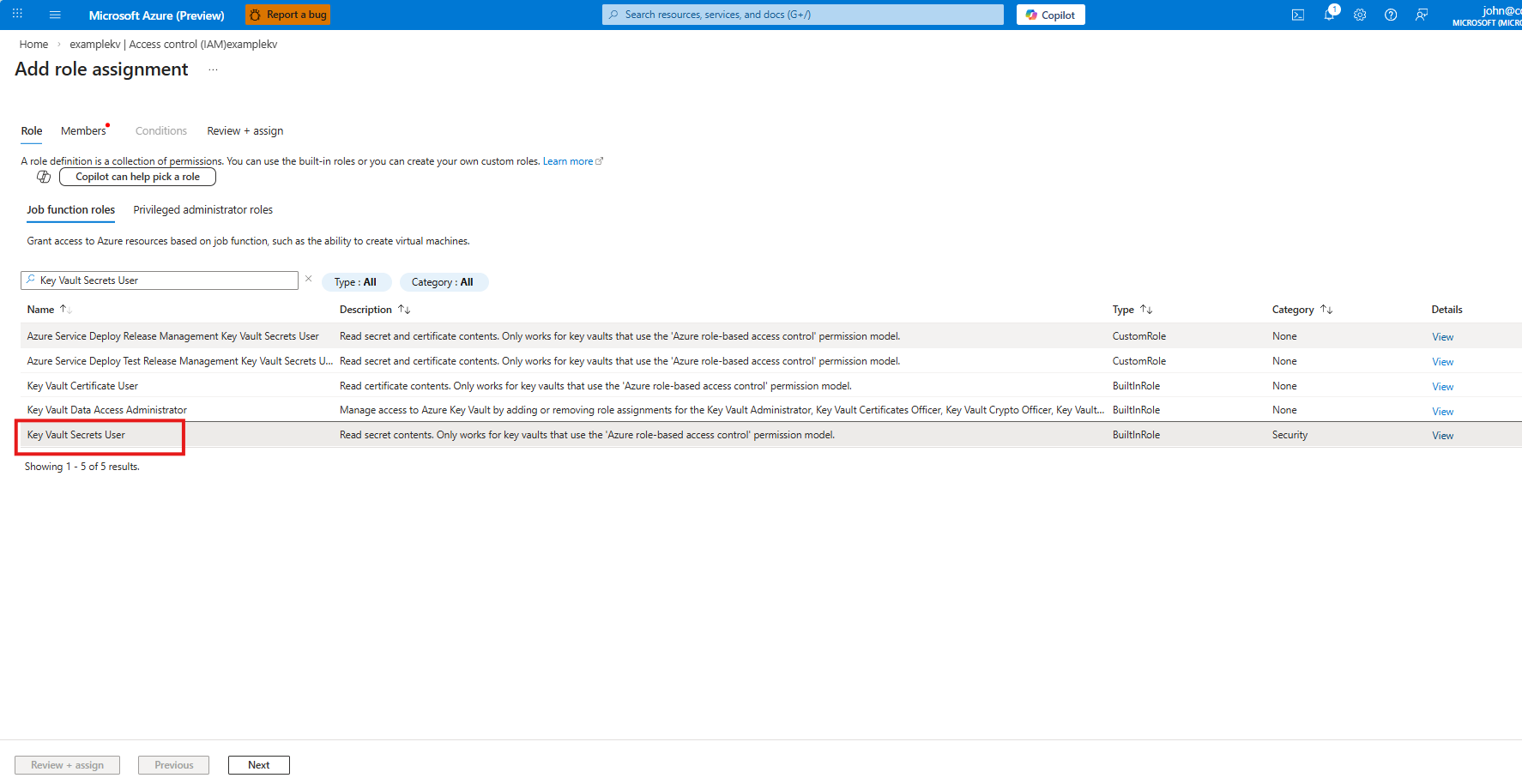 Nella scheda Ruolo selezionare Ruoli delle funzioni lavorative, cercare e selezionare Key Vault Secrets User (Utente segreti dell'insieme di credenziali delle chiavi) e quindi selezionare Avanti.