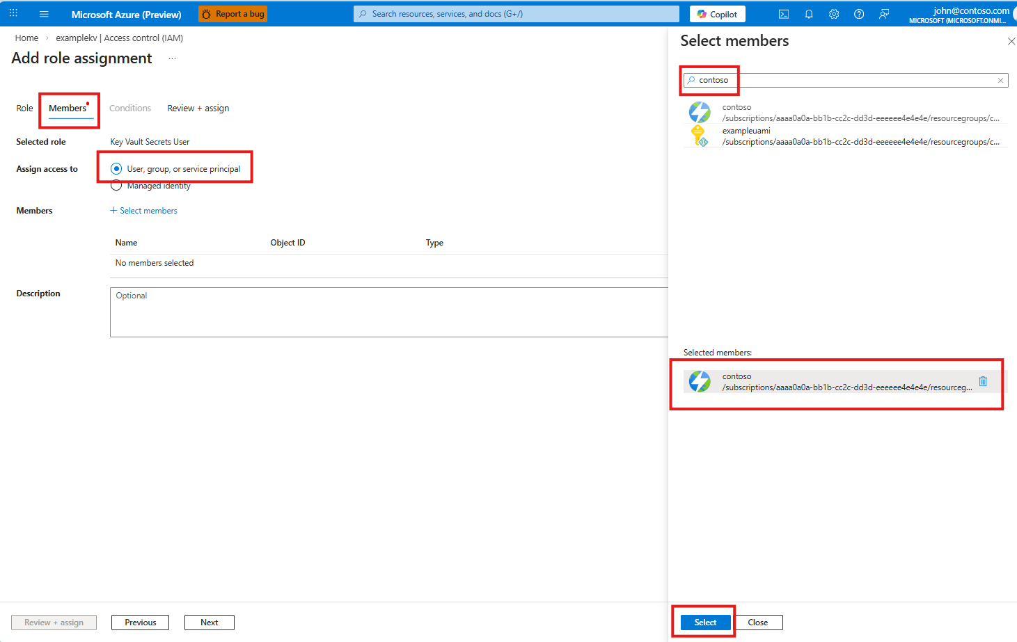 - Nella scheda Membri selezionare Utente, gruppo o entità servizio per Assegna accesso a.