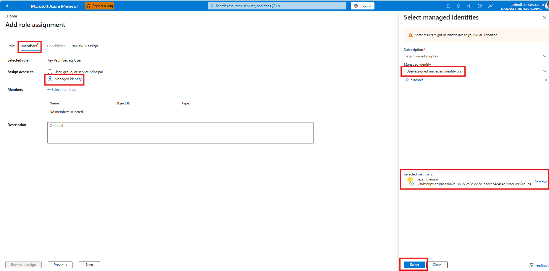Selezionare l'identità gestita assegnata dall'utente e fai clic su Seleziona.