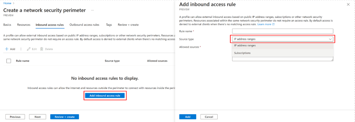 Nella pagina Aggiungi regola di accesso in ingresso selezionare il tipo di origine. È possibile usare questa impostazione per consentire l'accesso in ingresso a intervalli di indirizzi IP o sottoscrizioni specifici. Al termine, selezionare Avanti nella parte inferiore della pagina.