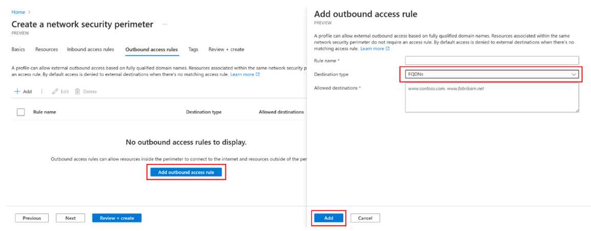 Nella pagina Regole di accesso in uscita, se si vuole consentire l'accesso in uscita, selezionare Aggiungi regola di accesso in uscita.