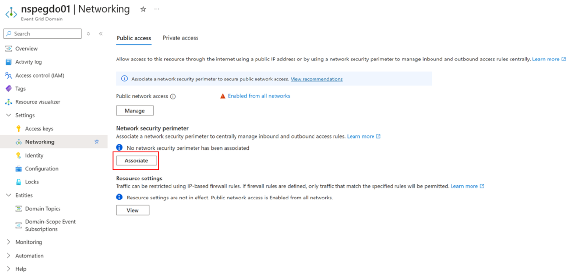 È ora possibile associare il perimetro di sicurezza di rete al dominio o all'argomento Griglia di eventi di Azure nelle impostazioni di rete selezionando Associa.
