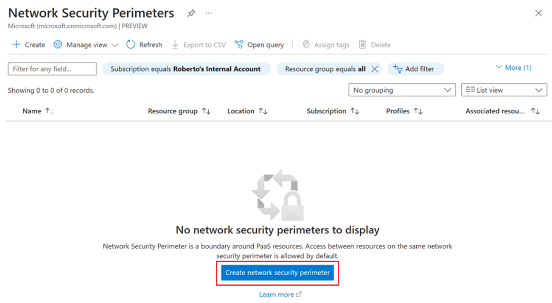 Nella portale di Azure cercare e passare alla pagina Perimetrali di sicurezza di rete e selezionare Crea sulla barra degli strumenti o Crea perimetro di sicurezza di rete nella pagina.
