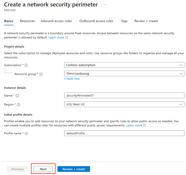 Il perimetro di sicurezza di rete è un framework creato per gestire il traffico pubblico verso le risorse PaaS (Platform-as-a-Service) di Azure e il traffico tra tali risorse PaaS. Il blocco predefinito di base è un perimetro, un gruppo di risorse PaaS che possono comunicare liberamente tra loro. Il perimetro definisce un limite con accesso di trust implicito tra ogni risorsa. Questo perimetro può avere set di regole di accesso in ingresso e in uscita.