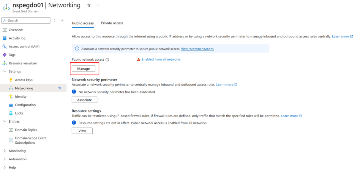 In questo passaggio si associa il perimetro di sicurezza di rete creato nel passaggio precedente al dominio griglia di eventi. Per configurare il perimetro di sicurezza di rete per un argomento o un dominio, usare la scheda Rete nell'argomento di Griglia di eventi o nella pagina Dominio di Griglia di eventi.