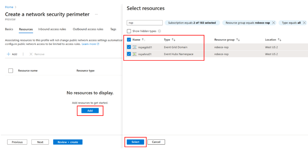 Nella pagina Risorse selezionare Aggiungi. Nella pagina Seleziona risorse selezionare quindi le risorse desiderate nel perimetro. Ad esempio, è possibile aggiungere un dominio Griglia di eventi di Azure e uno spazio dei nomi Hub eventi di Azure usato come gestore eventi o destinazione. Quindi seleziona Avanti.