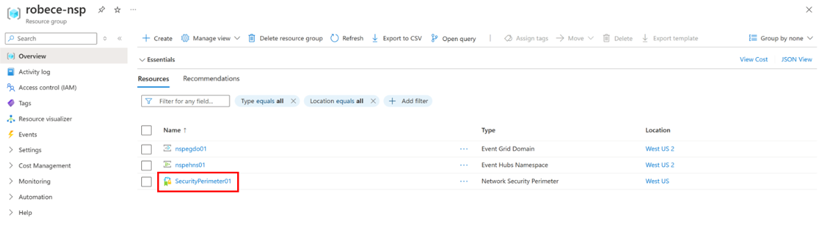 Dopo aver creato la risorsa perimetrale di sicurezza di rete, la si trova nel gruppo di risorse specificato.