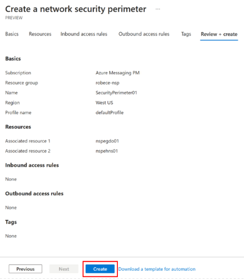 Nella pagina Rivedi e crea esaminare la configurazione e selezionare Crea per creare il perimetro di sicurezza.