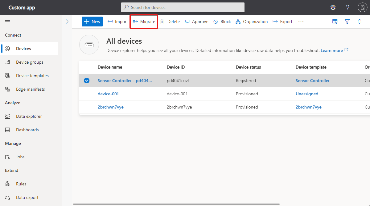 È possibile creare più versioni del modello di dispositivo. Nel corso del tempo, si avranno più dispositivi connessi usando questi modelli di dispositivo. È possibile eseguire la migrazione dei dispositivi da una versione del modello di dispositivo a un'altra. I passaggi seguenti descrivono come eseguire la migrazione di un dispositivo: