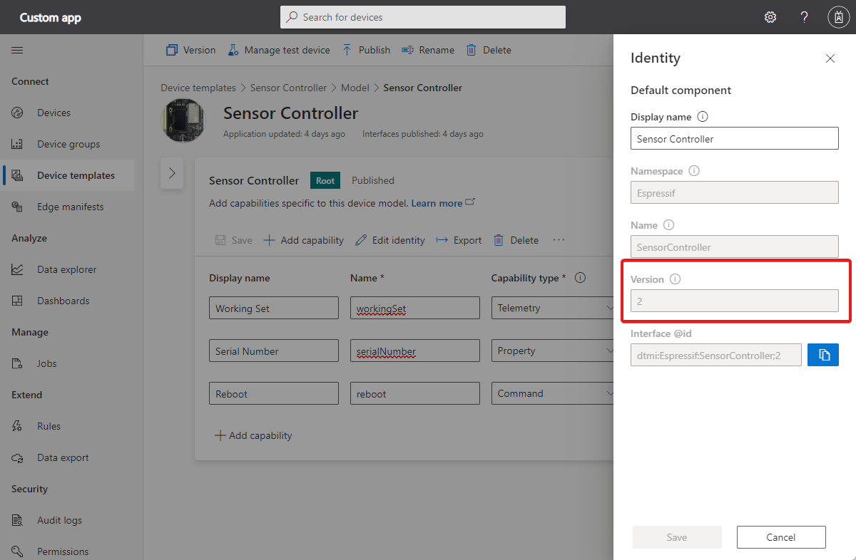 - Versione di un modello. Quando si esegue la versione di un modello di dispositivo, viene creato un nuovo modello con tutte le modifiche salvate più recenti. Le modifiche apportate a una nuova versione non influiscono sulle istanze del dispositivo esistenti. Per ulteriori informazioni, vedere Versionare un modello di dispositivo.