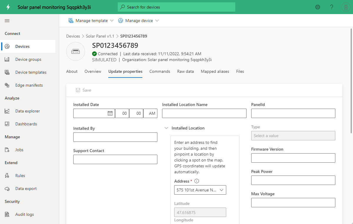 Selezionare il dispositivo di esempio SP0123456789. Dalla scheda Proprietà aggiornamento, è possibile aggiornare le proprietà scrivibili del dispositivo e visualizzare una rappresentazione visiva dei valori aggiornati nel dashboard.