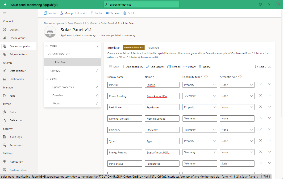 Per visualizzare il modello di dispositivo del pannello solare, selezionare la scheda Modelli di dispositivo . Il modello dispone di interfacce predefinite per dati, proprietà, comandi e viste.