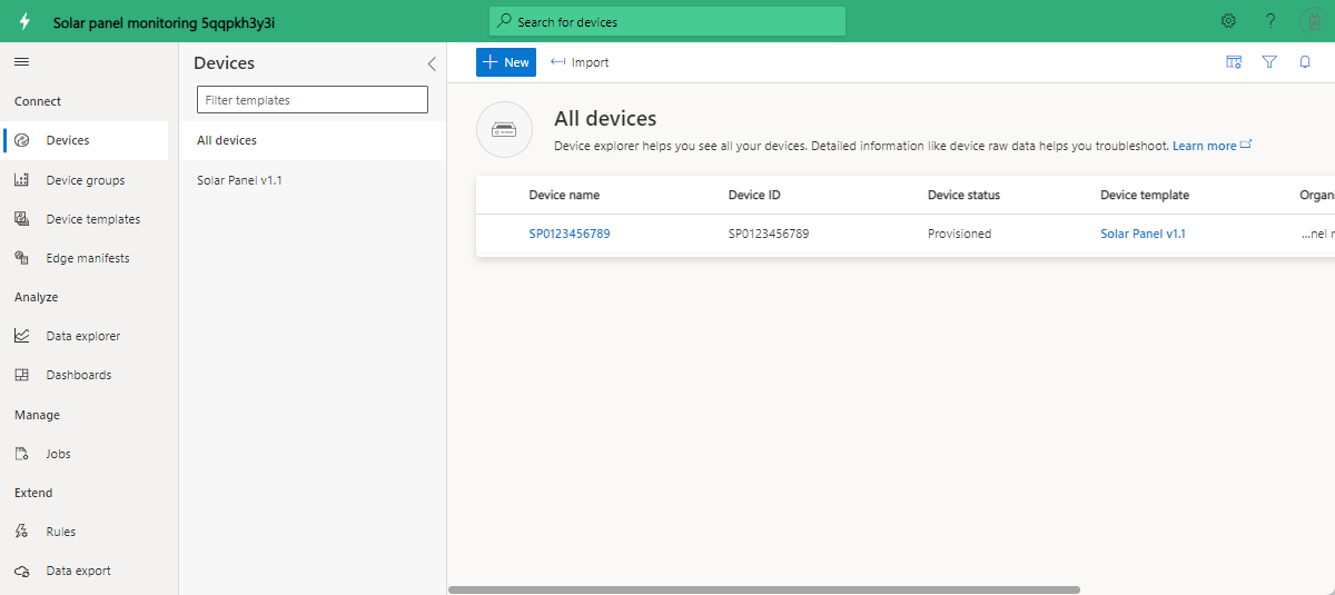 L'app viene fornita con un dispositivo pannello solare di esempio. Per visualizzare i dettagli del dispositivo, selezionare Dispositivi.