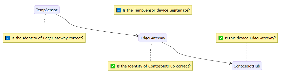 Applicando tutti questi concetti, TempSensor può verificare che stia comunicando con il vero EdgeGateway perché ha presentato un certificato corrispondente all'indirizzo e il certificato è firmato da una radice attendibile.