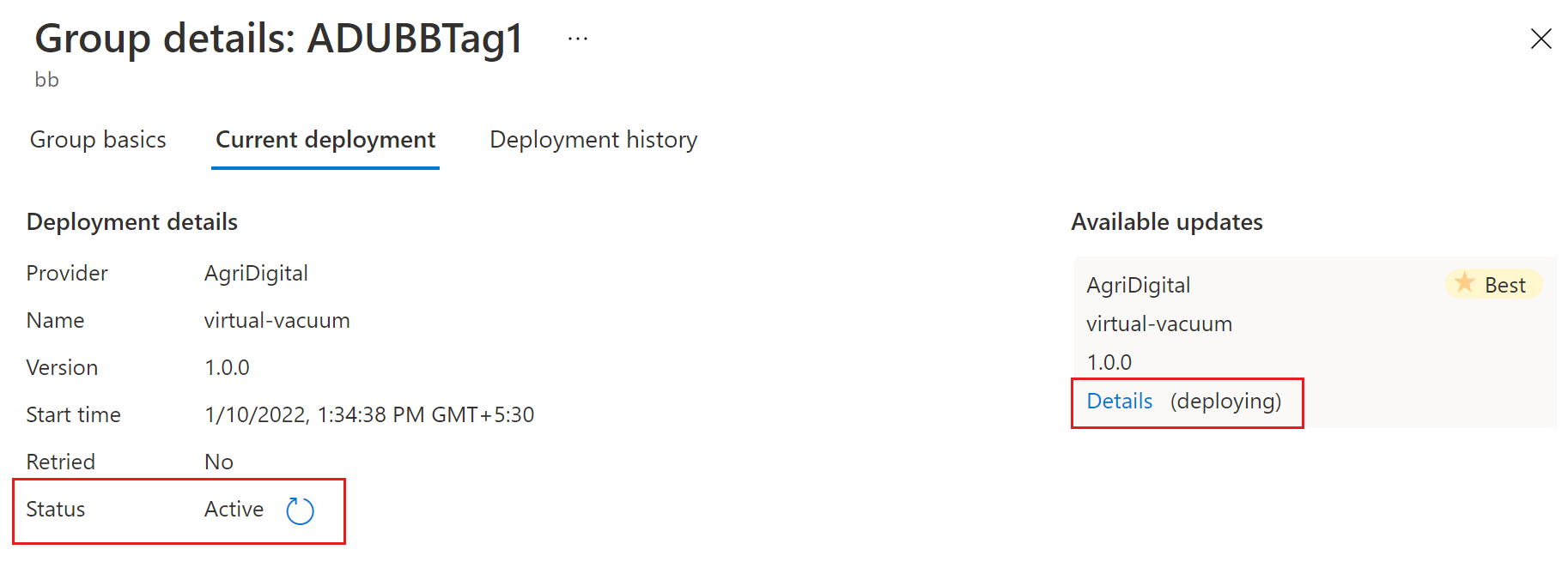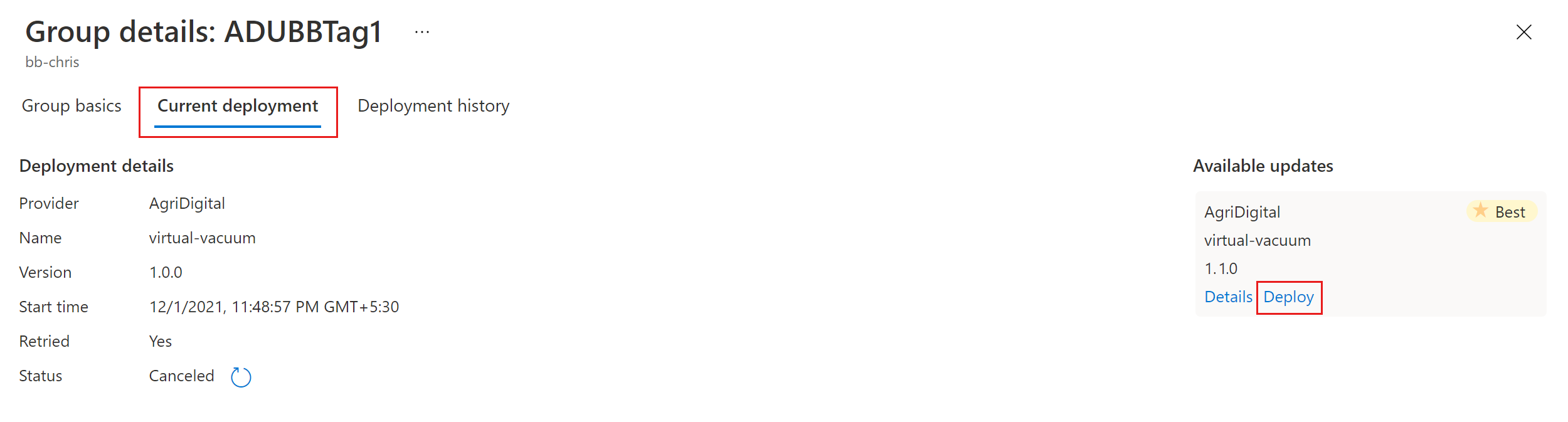 Nella pagina Dettagli gruppo selezionare la scheda Distribuzione corrente e quindi selezionare Distribuisci accanto all'aggiornamento desiderato nella sezione Aggiornamenti disponibili. Il miglior aggiornamento disponibile per il gruppo è indicato con un'evidenziazione migliore .