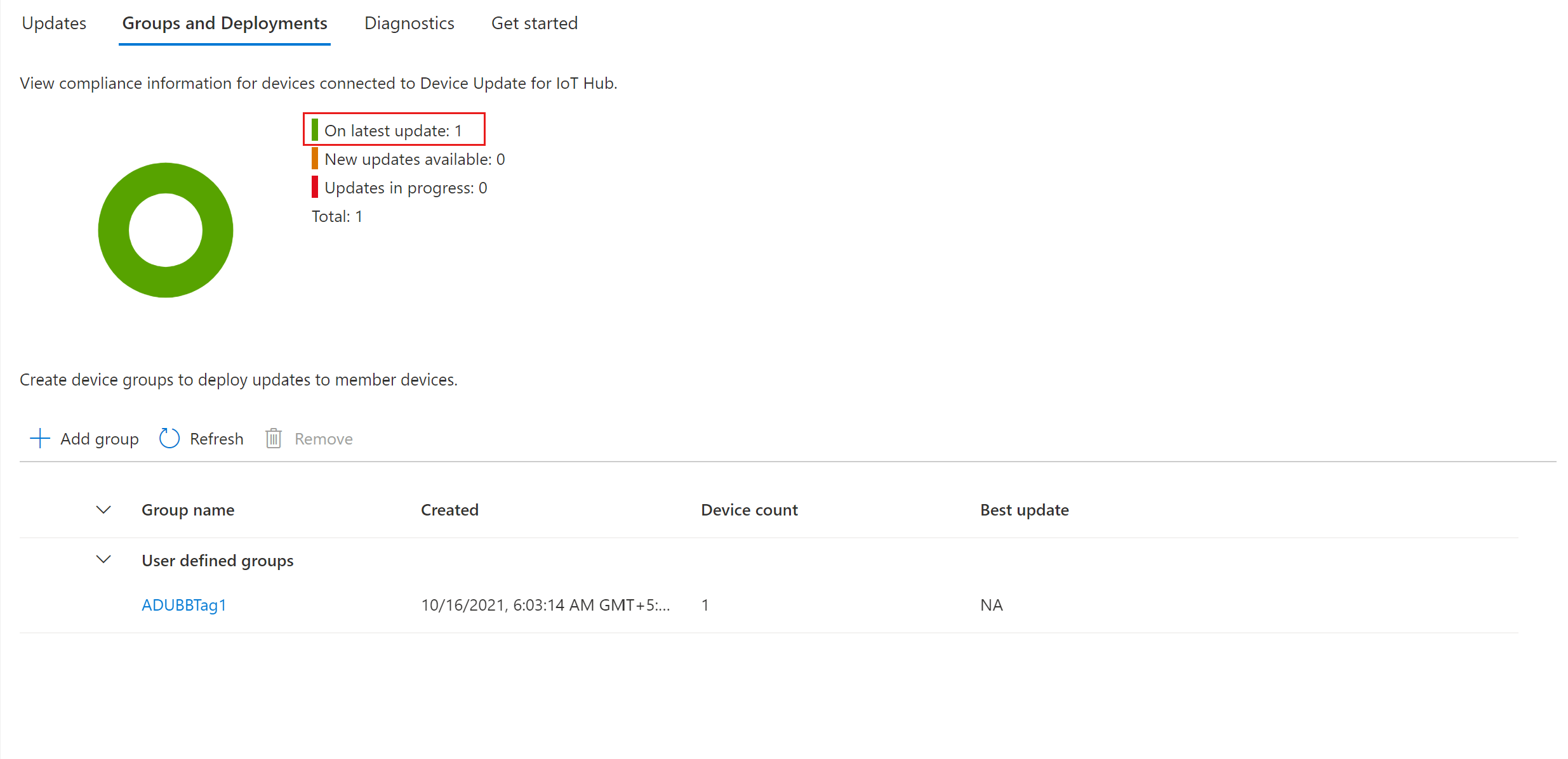 È possibile usare il tag di gruppo applicato al dispositivo per distribuire l'aggiornamento al gruppo di dispositivi. Selezionare la scheda Gruppi e distribuzioni nella parte superiore della pagina Aggiornamenti per visualizzare l'elenco di gruppi e distribuzioni e il grafico di conformità degli aggiornamenti.