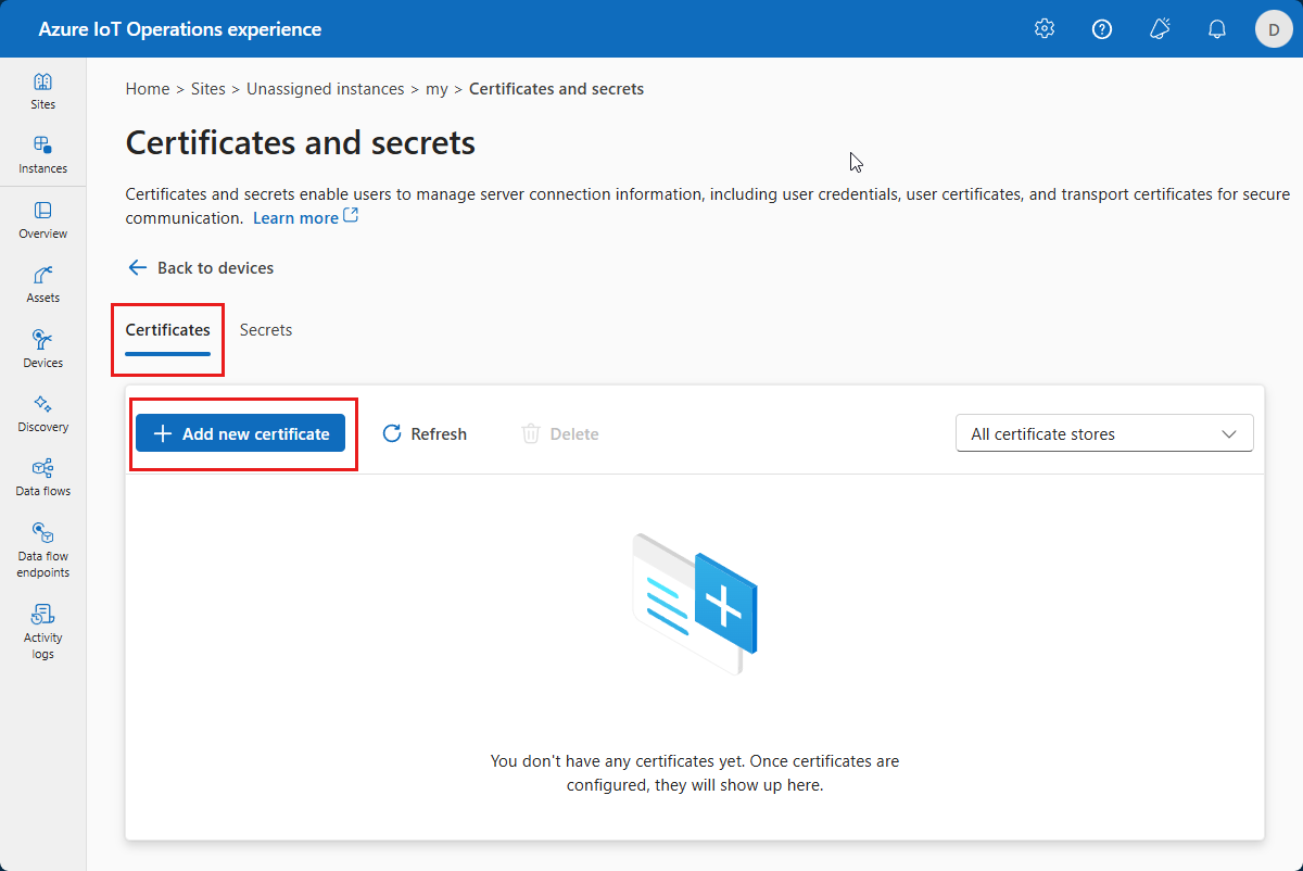 Nella pagina Certificati e segreti selezionare Aggiungi nuovo certificato: