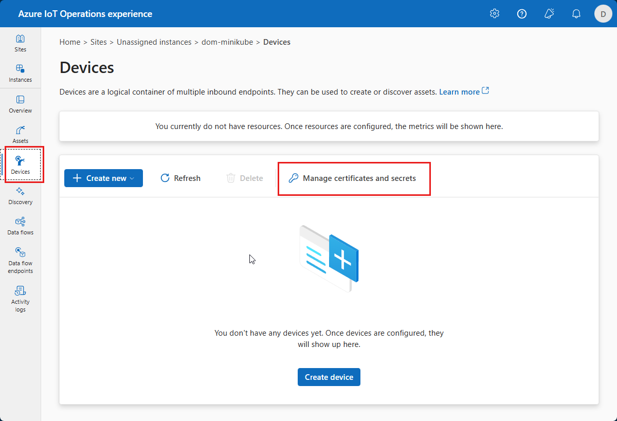 opc-ua-connectordispositivo creato nei passaggi precedenti. - Spazi dei nomi: è possibile visualizzare lo spazio dei nomi creato quando hai distribuito le Operazioni IoT di Azure. Lo namespace contiene l'asset e il dispositivo creati nei passaggi precedenti.