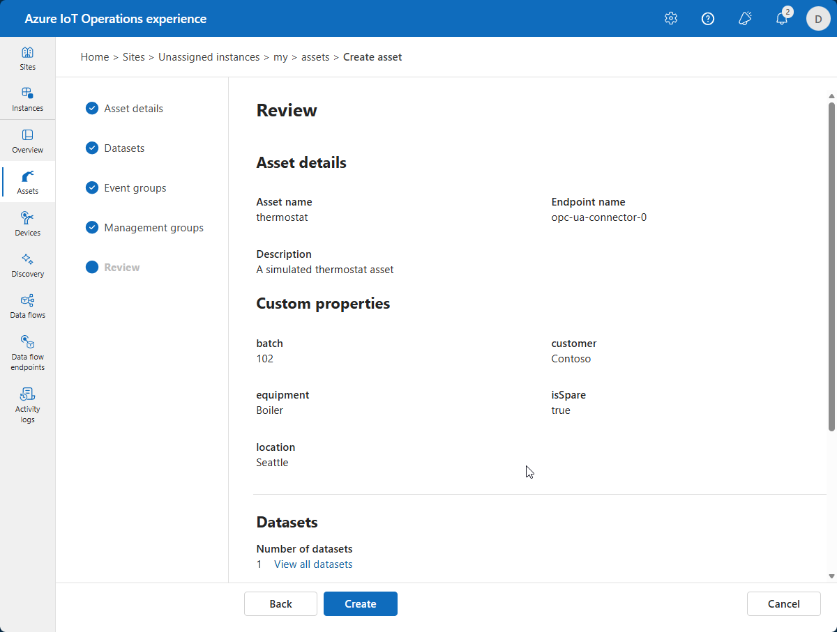 Esaminare i dettagli dell'asset e del tag e apportare eventuali modifiche necessarie prima di selezionare Crea: