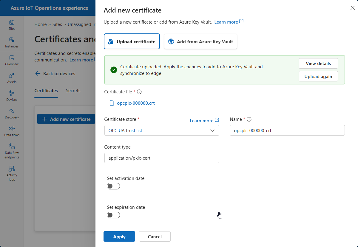 opcplc-000000.crtscaricato in precedenza. Selezionare quindi Carica:Selezionare Applica.