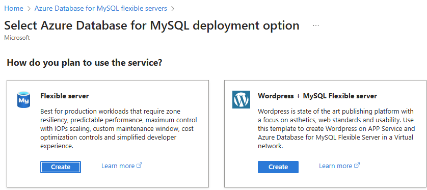 Nel riquadro Selezionare l'opzione di distribuzione di Database di Azure per MySQL selezionare Server flessibile come opzione di distribuzione: