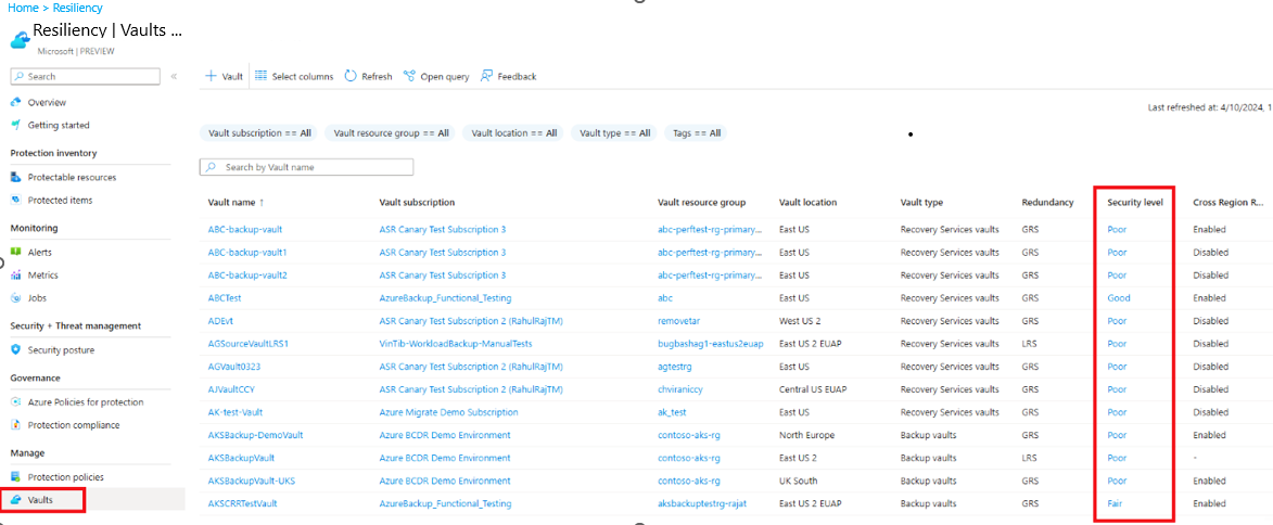 Nella sezione Resilienza, vai a Gestisci>Vault per visualizzare un elenco di tutti i vault tra sottoscrizioni, gruppi di risorse, posizione, tipo e altro ancora, insieme alle relative proprietà.
