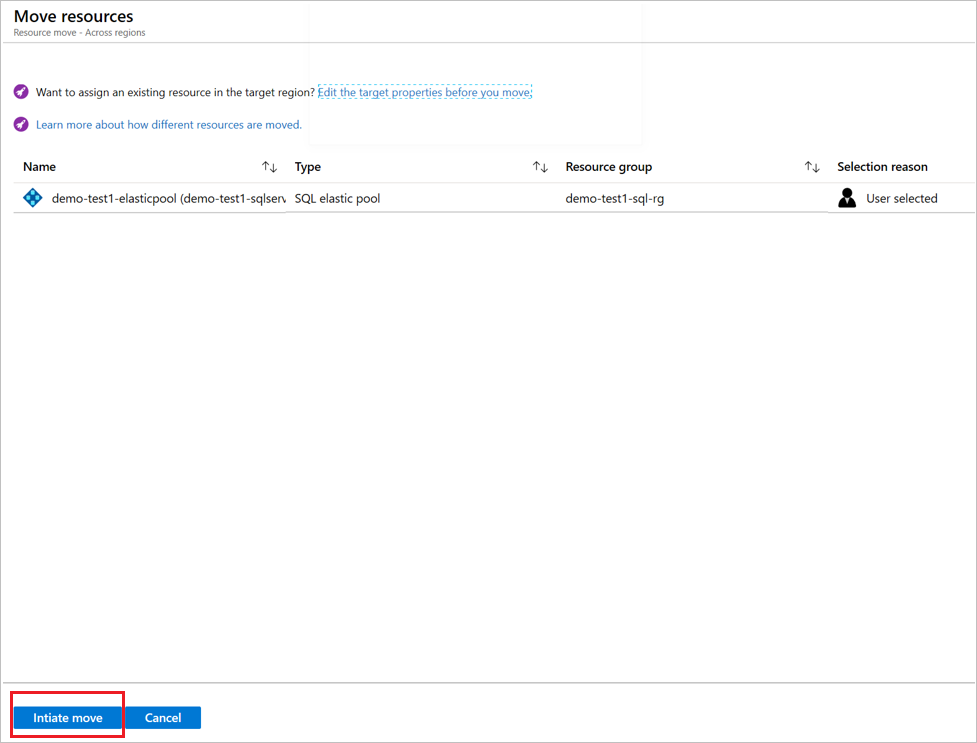 Azure Resource Mover attualmente non sposta SQL Server tra aree. È prima necessario assegnare un'istanza di SQL Server di destinazione nell'area di destinazione e quindi eseguire il commit dello spostamento.
