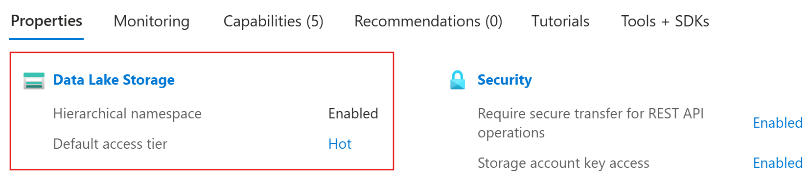 | Azure Data Lake Storage (ADLS) Gen2 | Si tratta di un account Archiviazione di Azure con uno spazio dei nomi gerarchico abilitato. Per verificare di avere Data Lake Storage, controllare la scheda Properties nella pagina Overview.