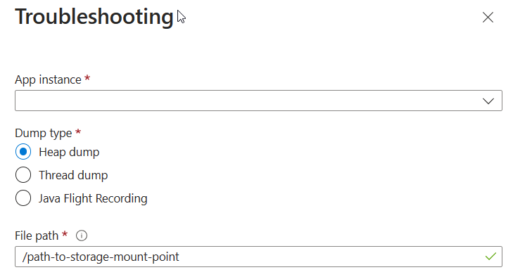 - Archiviazione permanente personalizzata, come descritto in Come abilitare l'archiviazione permanente in Azure Spring Apps. Questa risorsa di archiviazione viene usata per salvare i file di diagnostica generati. I percorsi specificati nei valori dei parametri seguenti devono trovarsi nel percorso di montaggio dell'archiviazione permanente associata all'app. Se si vuole usare un percorso nel percorso di montaggio, assicurarsi di creare in anticipo il sottopercorso.