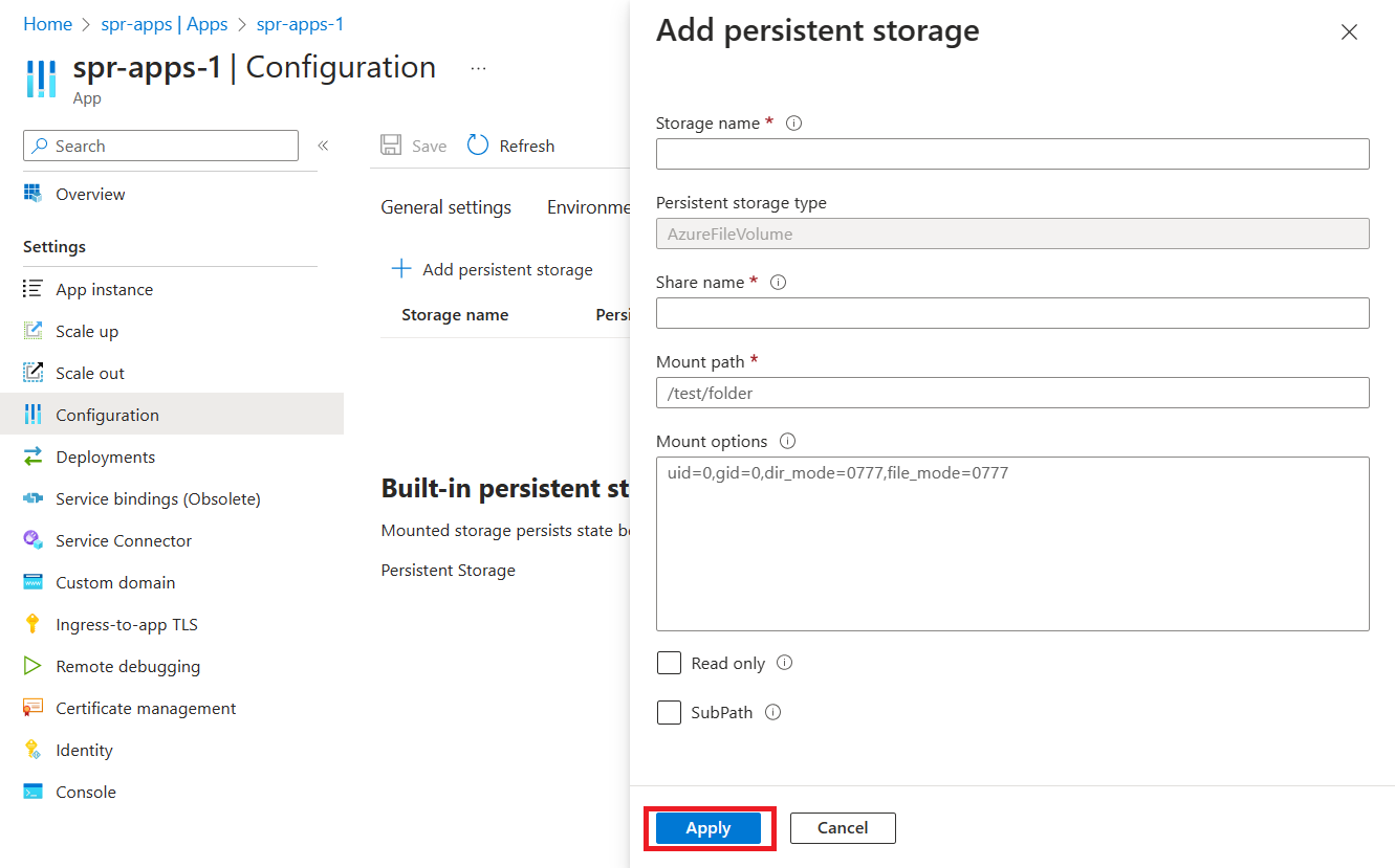 Impostazione Valore Nome di archiviazione Nome della risorsa di archiviazione immessa in precedenza. Tipo di archiviazione persistente AzureFileVolume Nome condivisione Nome della condivisione File di Azure nell'account Archiviazione di Azure. Percorso di montaggio Percorso di montaggio univoco. Opzioni di montaggio Facoltativo Sola lettura Facoltativo Selezionare Salva per applicare le modifiche alla configurazione.