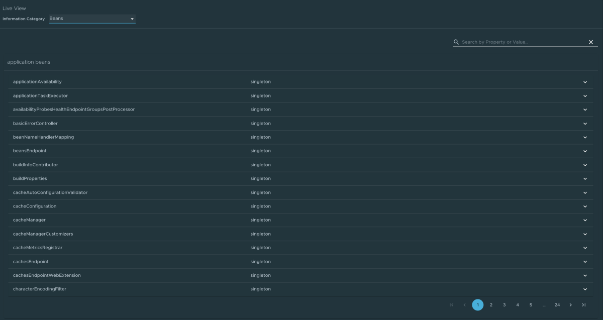 Per passare alla pagina Fagioli , selezionare l'opzione Fagioli dall'elenco a discesa Categoria informazioni. La pagina Beans fornisce informazioni su un elenco di tutti i fagioli dell'app e le relative dipendenze. Vengono visualizzate le informazioni sul tipo di bean, sulle dipendenze e sulla relativa risorsa.