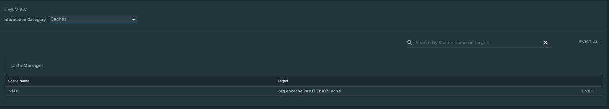 Per passare alla pagina Cache , selezionare l'opzione Cache dall'elenco a discesa Categoria informazioni. La pagina Cache consente di accedere alle cache dell'app. Fornisce i dettagli dei gestori della cache associati all'app, incluso il nome completo della cache nativa.