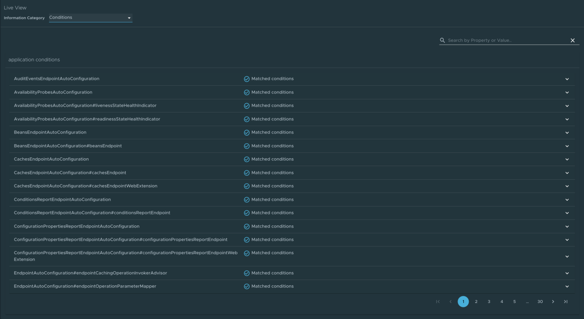 Per passare alla pagina Condizioni , selezionare l'opzione Condizioni dall'elenco a discesa Categoria informazioni. Il report di valutazione delle condizioni fornisce informazioni sulla valutazione delle condizioni nelle classi di configurazione e configurazione automatica. Per Spring Boot, il report di valutazione delle condizioni offre una visualizzazione chiara di tutti i fagioli configurati nell'app.