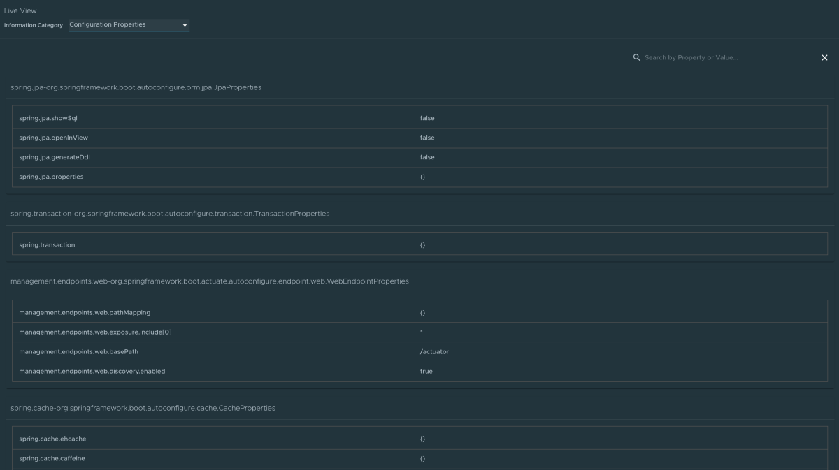 Per passare alla pagina Proprietà di configurazione, selezionare l'opzione Proprietà di configurazione dall'elenco a discesa Categoria informazioni. La pagina Proprietà di configurazione fornisce informazioni sulle proprietà di configurazione dell'app. Per Spring Boot, visualizza i fagioli dell'app @ConfigurationProperties . Fornisce uno snapshot di tutti i fagioli e delle relative proprietà di configurazione associate.