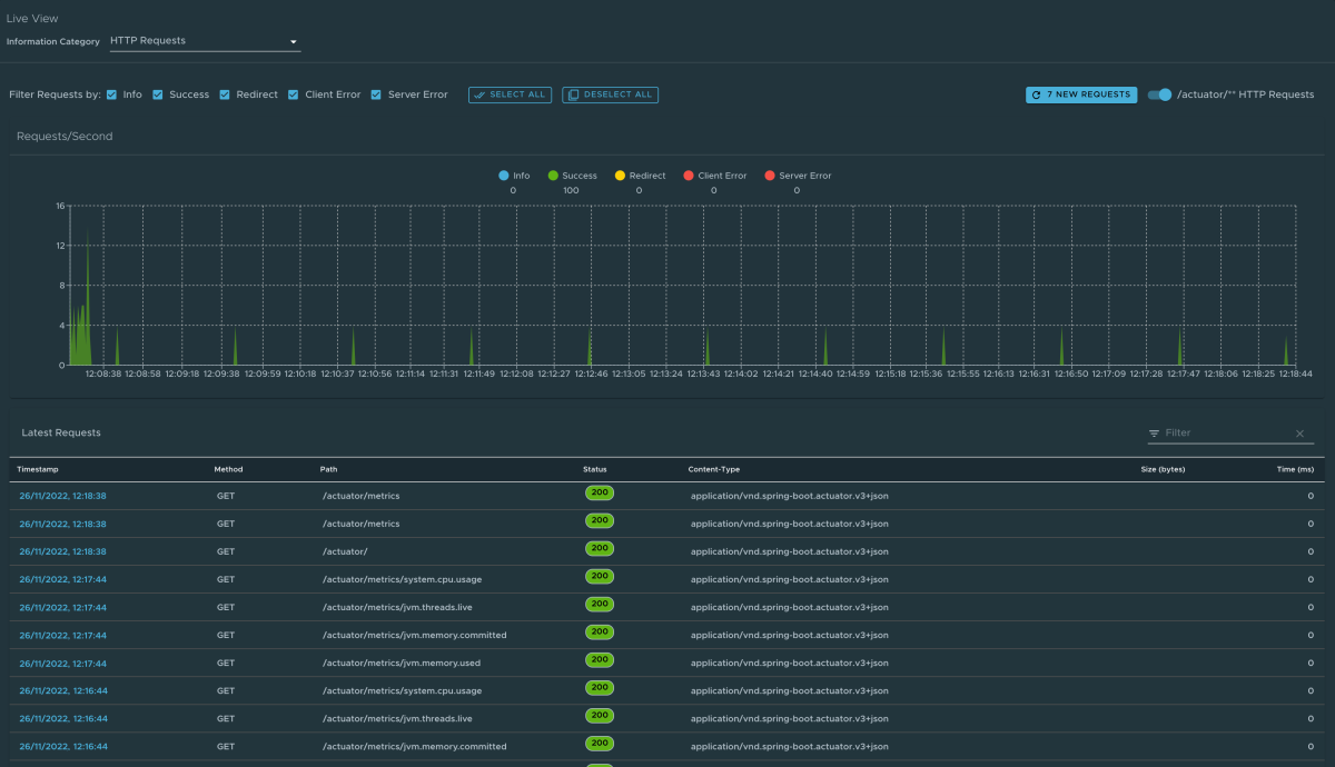 Per passare alla pagina Richieste HTTP, selezionare l'opzione Richieste HTTP dall'elenco a discesa Categoria informazioni. La pagina Richieste HTTP fornisce informazioni sugli scambi http di richiesta-risposta all'app. Il grafico visualizza le richieste al secondo che indicano lo stato della risposta di tutte le richieste.