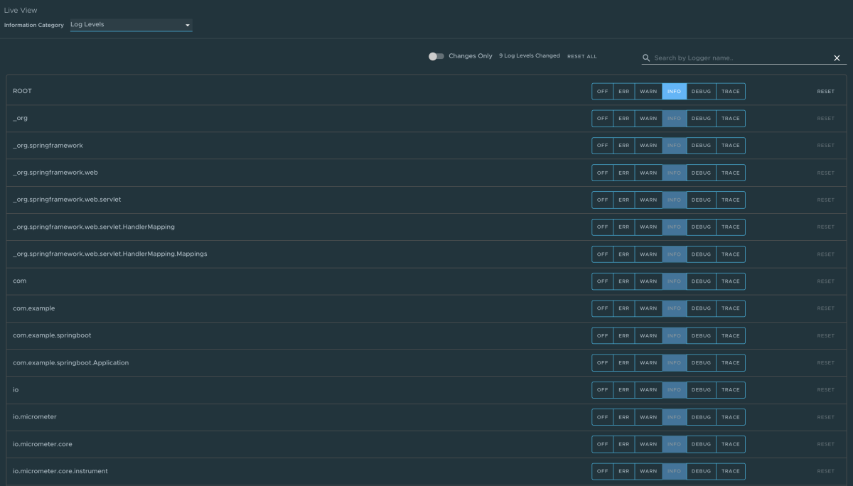 INFO,DEBUGeTRACE, in tempo reale dall'interfaccia utente. - Cercare un pacchetto e modificarne il rispettivo livello di log.