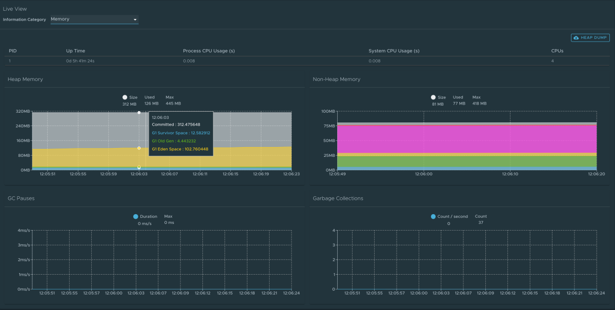 Questa visualizzazione grafica avviene in tempo reale e mostra solo i dati in tempo reale. Come accennato in precedenza, le funzionalità di Application Live View non archiviano informazioni. Ciò significa che i grafici visualizzano i dati nel tempo solo per il periodo di permanenza in tale pagina.