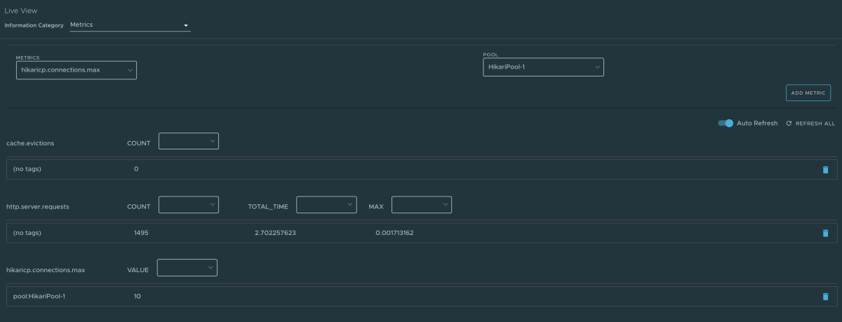- Selezionare Aggiungi metrica per aggiungere la metrica, che viene aggiornata ogni cinque secondi per impostazione predefinita.
